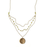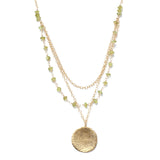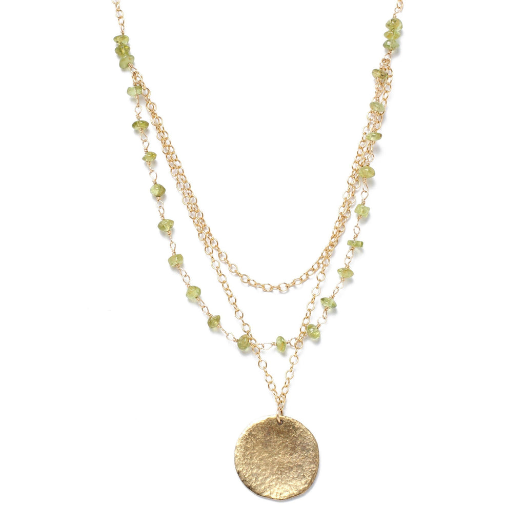 Triple strand necklace with peridot stones and hand hammered circle disc pendat. Top chain is 16", middle chain is 17", bottom chain is 18".