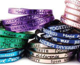 You can make a difference too with this delicately crafted wrap around bracelet. The bracelet is accented with inspirational verbiage in a silver or black foil. Rainbow themed colour choices express energy and enthusiasm. Metallic finish. Wear one on it's own or stack them up to your elbow!