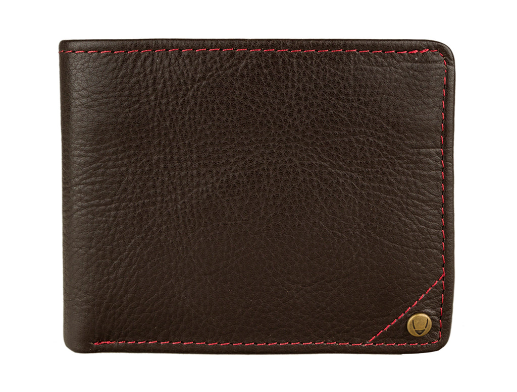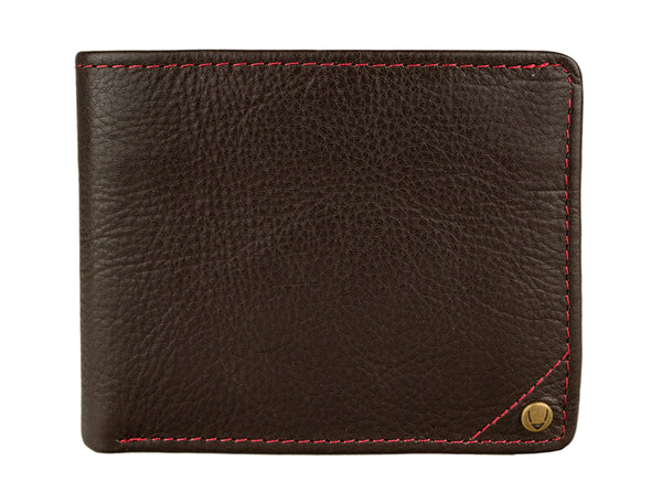 A slim bifold leather wallet with a stylish contrast stitch detail on the exterior of the wallet and a small Hidesign branded brass rivet. The black wallet has a blue contrast stitch and blue cotton lining, and the brown wallet has red contrast stitch detail and red cotton lining.