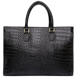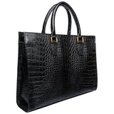 A classic and elegant women's work bag. This bag is sure to stand out and pairs beautifully with office attire. The bag is not bulky, yet can fit necessary papers and a tablet or iPad. "Leather: Rich full grain croco pattern embossed leather.. Lining: Red cotton for brown bag and black polyester for black bag Closure: magnetic snap button. Handles & Strap: Detachable leather shoulder strap and two leather top handles. Interior Details: One main compartment, one center zip compartment, several small interior pockets for mobile phones and accessories, one dog lock hook to fasten keys. Measurements: 14.57""L x 10.24""H x 3.74""W"