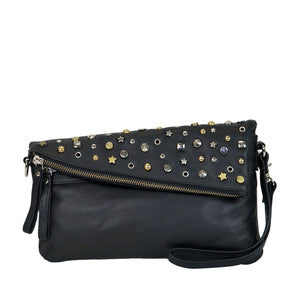 | Diagonal Studded Zippered Flap Small Cross Body in Soft Nappa with Additional Wrist Strap | |
