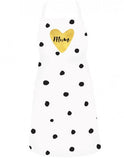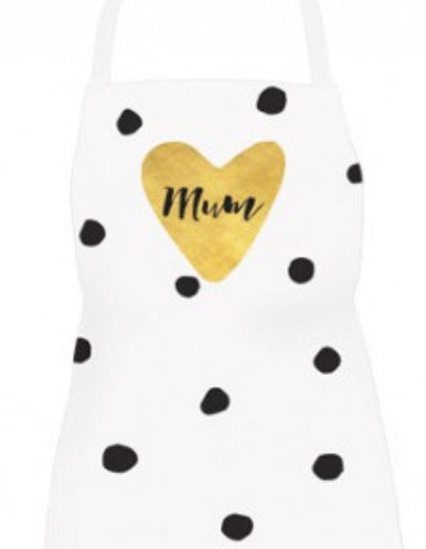 White apron with screen printed black dots and a gold heart with Mum in the centre.